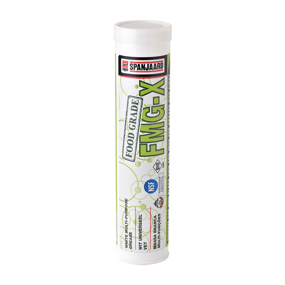 Spanjaard FMG-X White Multi-Purpose Grease (Food Grade) es una grasa multipropósito blanca de alto rendimiento, adecuada para su uso en entornos de presión extrema y alta temperatura donde puede ocurrir un contacto incidental con alimentos. Los aditivos poliméricos confieren propiedades de resistencia al agua. Todas las materias primas utilizadas en la fabricación del producto cumplen con la sección 21 CFR 178.3570 de la FDA. y el producto está registrado en la NSF como lubricante de categoría H1. También se puede utilizar en entornos de envasado, farmacéuticos y otros entornos de salas limpias. Certificación Halaal y Kosher.